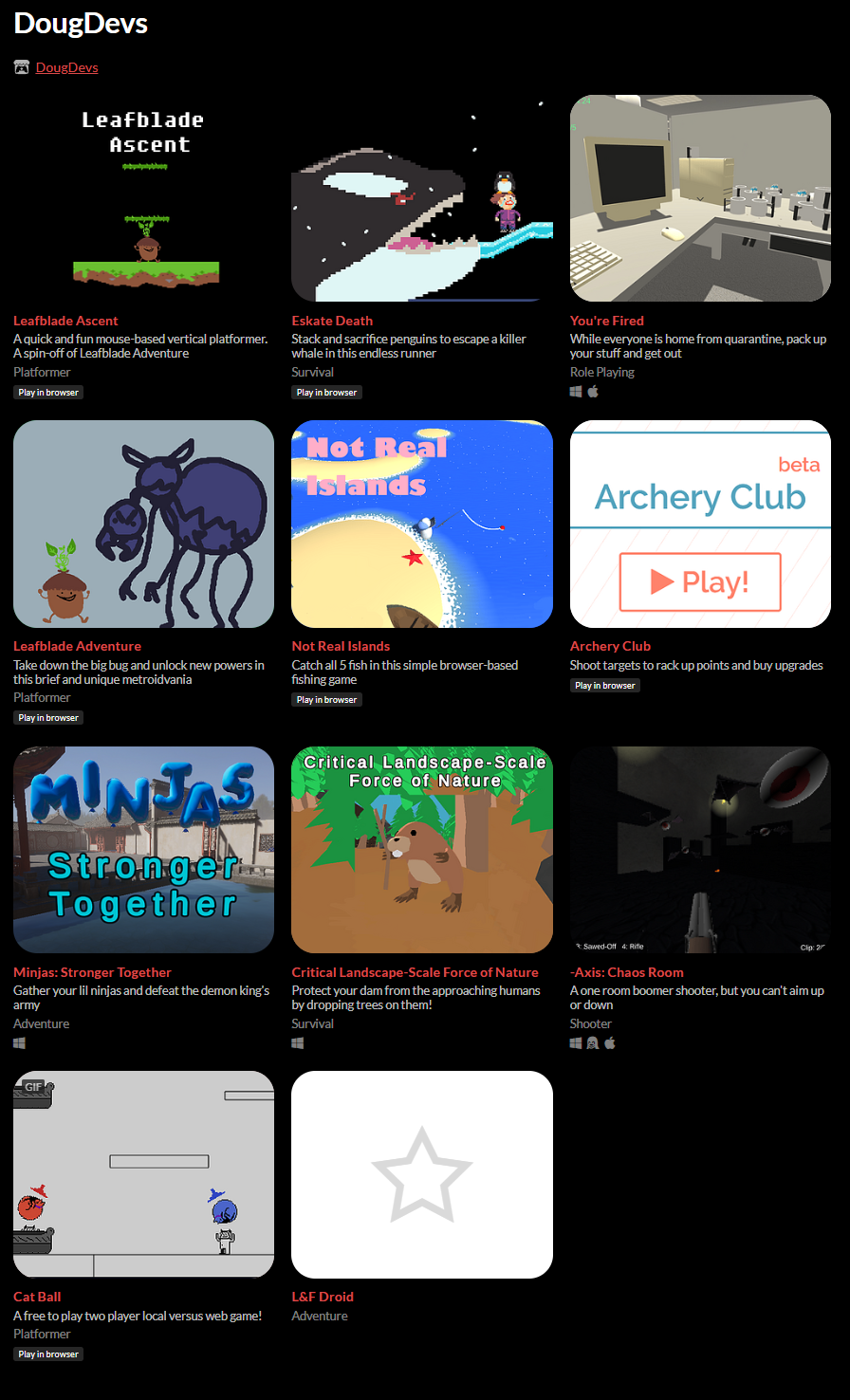Prefer to play games in-browser rather than on a mobile device? Want to check out some fun and unique game jam projects that are playable on Windows? Why not take a look at my games published for free at dougdevs.itch.io